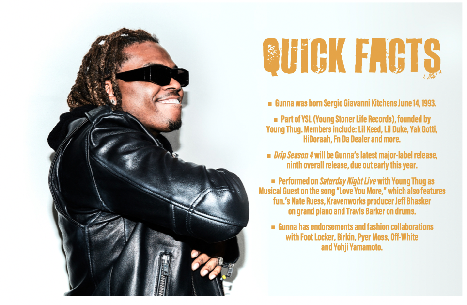 Another creative outlet for the rapper is fashion and design—Gunna has recently partnered with Foot Locker, on top of endorsements and fashion shows for Birkin, Pyer Moss, Off-White and Yohji Yamamoto.