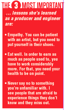 Since 2015, Ayerbe has been a member of SoundGirls, an organization of women in audio. One of the inequalities she often sees originates on the business side rather than the creative. “The biggest problem comes from label people, because they’re not used to working with women,” she asserts. “They’re the ones that make or break whether the project gets funded. I work in the indie industry and get very few label projects, because at some point someone isn’t ready to work with a woman. Almost every other female in production and engineering that I know––Emily Lazar aside––works in the indie market. But it is changing. Ebonie Smith at Atlantic, for example. She’s an incredible engineer.”