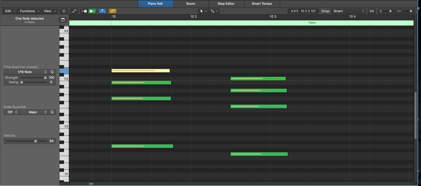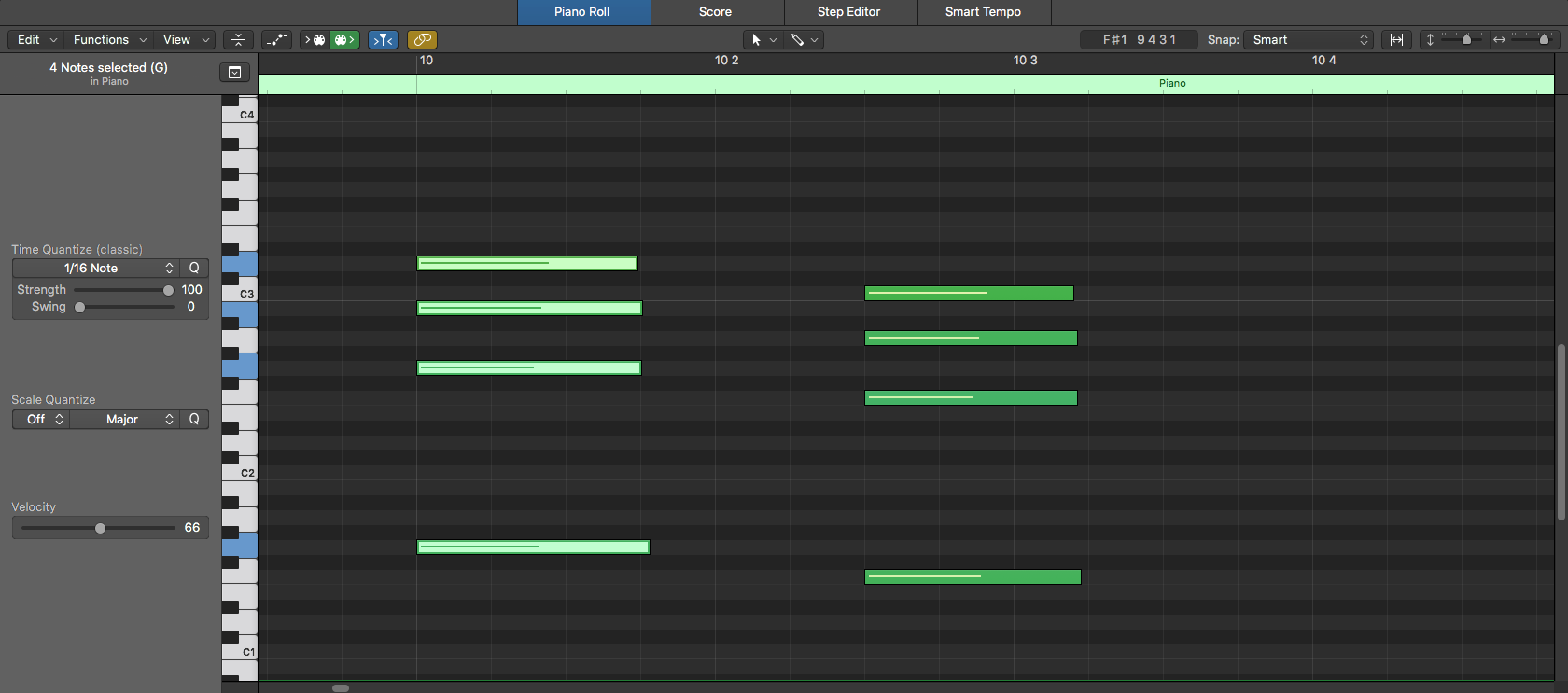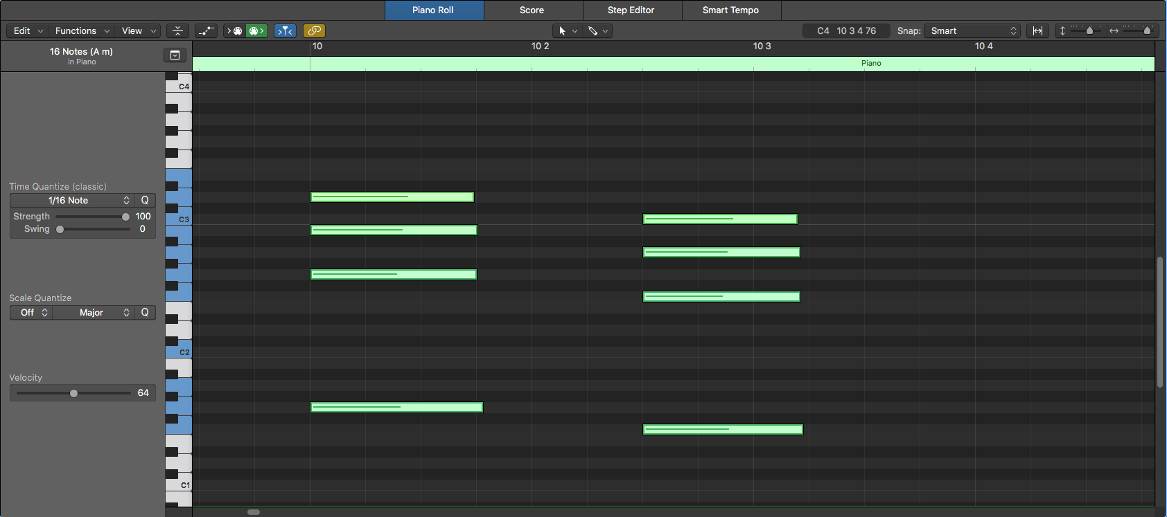 Notice how the MIDI events can be easily quantized according to a specified note division by pressing Command + A to “select all” and then the letter Q to quantize: